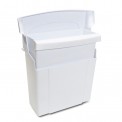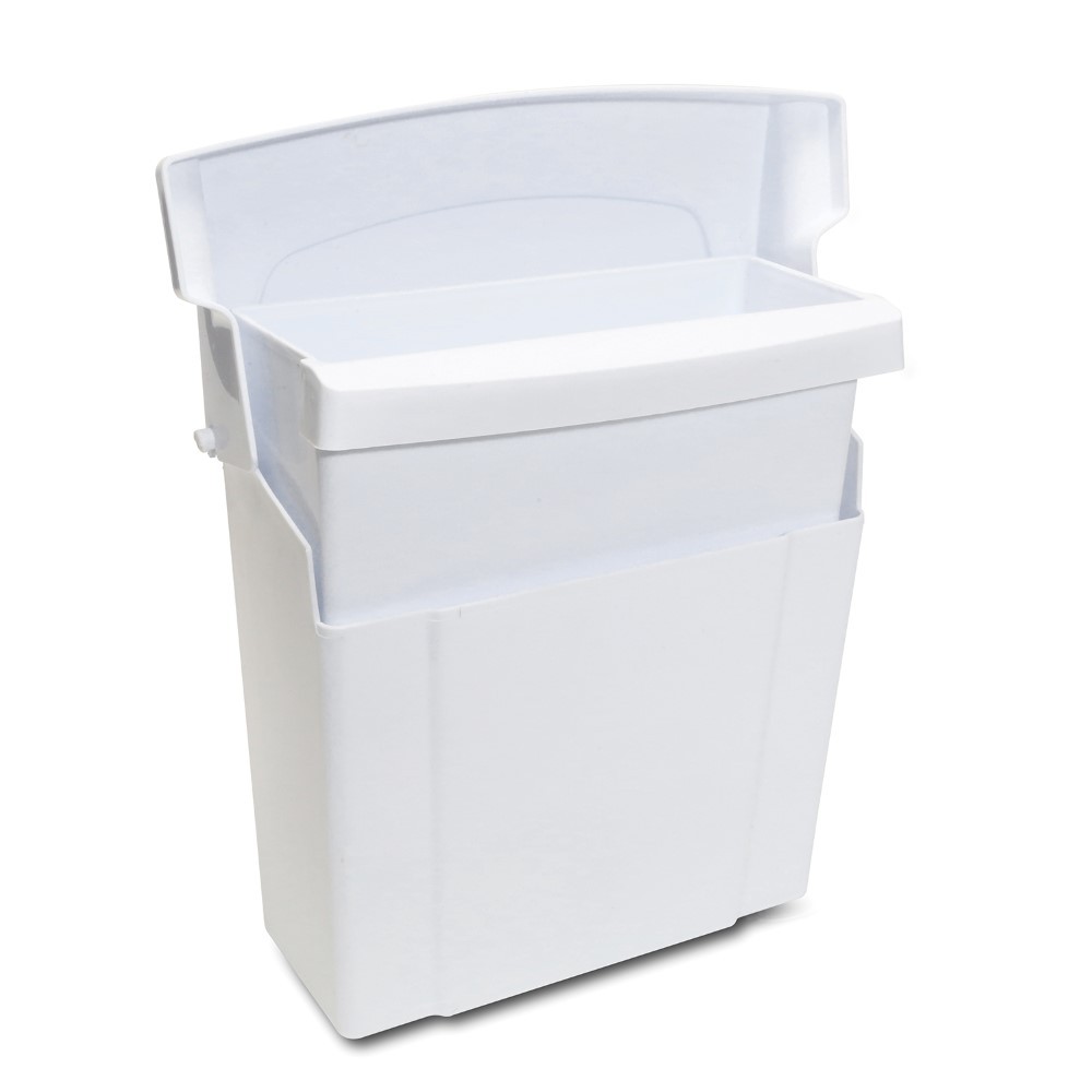 The wall mounted, sturdy plastic Sanitary Napkin Receptacle features a hinge lid that closes tightly for odor control. The removable rigid liner is easy to clean and allows for quick disposal.