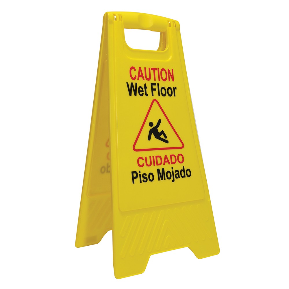 Our rugged heavy-duty Floor Safety Sign is a bright yellow floor sign that communicates the necessary warning in English and Spanish to help maintain safety.